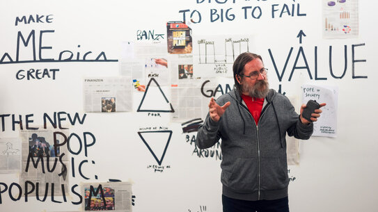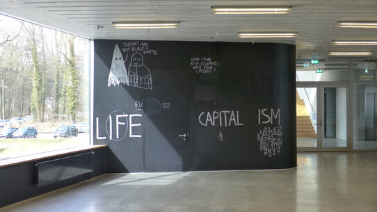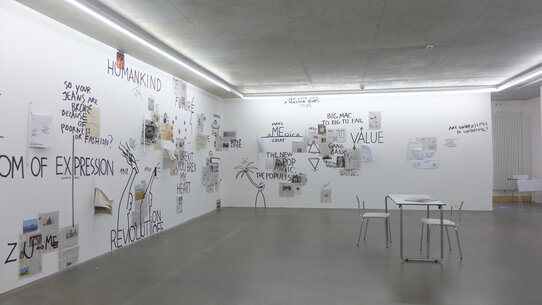 For a week before the exhibition opened on 3rd March 2017, Dan Perjovschi worked in a highly visible process around the ZU campus, inscribing his political and socio-critical reflections using white chalk on the University’s blackboard walls, and marker pen on the gallery walls and windows of the „White Box“, in which space he addressed the crisis of capitalism.