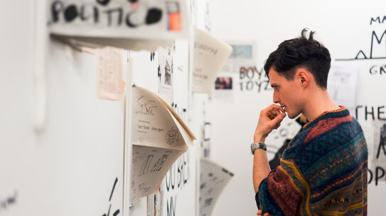 Perjovschi considers drawing as a form of exploration and knowledge production. His works are based on recording and processing, on critical reflection and the constant revision of his own thinking. He prepares his exhibition projects far in advance and creates a location-specific sketchbook for each project. In his site-specific drawing, he tries-out his earlier considerations to distill complex political, societal and cultural situations using only a few lines. In doing so, he deftly and concisely examines current paradoxes and contradictions.