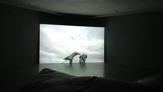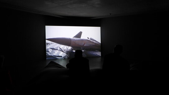 On view is the video Pranayama Organ (2021), in which two life-size inflatable decoy military fighter planes, a Falcon and a Typhoon, become protagonists. Shot on the coast of southern England, the film shows the two dummies lying on a beach. The airplane replicas - which are actually used in the military to mislead the enemy - slowly fill with air, as if they were gently coming to life.