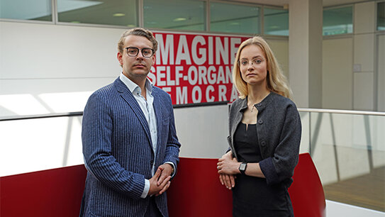 Change of office: The new student vice president Fabian J. Zitzmann and his predecessor Josefine M. Meibert. (Photo: ZU/Sebastian Paul)