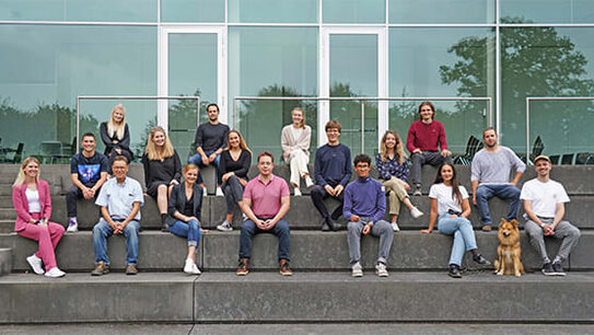 Moving into the start-up and innovation center at Zeppelin University: Representatives of the award-winning start-ups and initiatives with Lisa Benzkirch, Thomas Brandt and Lea Heinrich from the "PioneerPort" team (front row from left). (Photo: ZU/Sebastian Paul)
